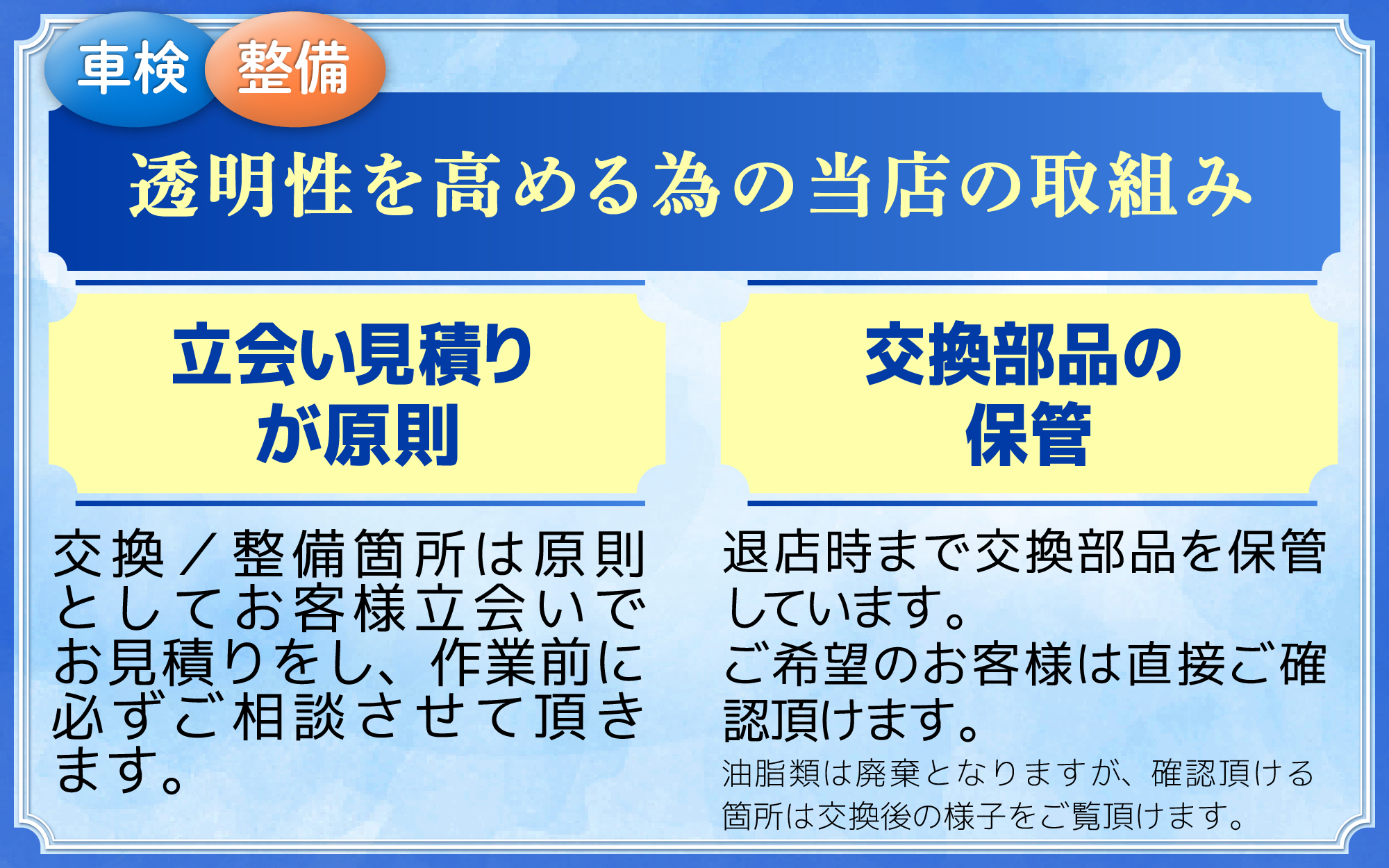 電話予約時から非常に丁寧に対応していただけたので、来店するのが楽しみになりました。事前点検時には、交換が必要な箇所と不要な項目を分かりやすく説明していただけたので、納得感があり安心してお任せできると感じました。